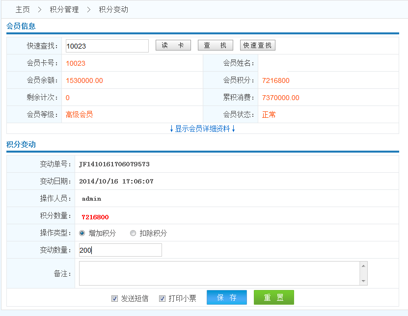 操作流程: 選中會(huì)員------>選擇異動(dòng)類型------>填寫異動(dòng)數(shù)量------>提交保存