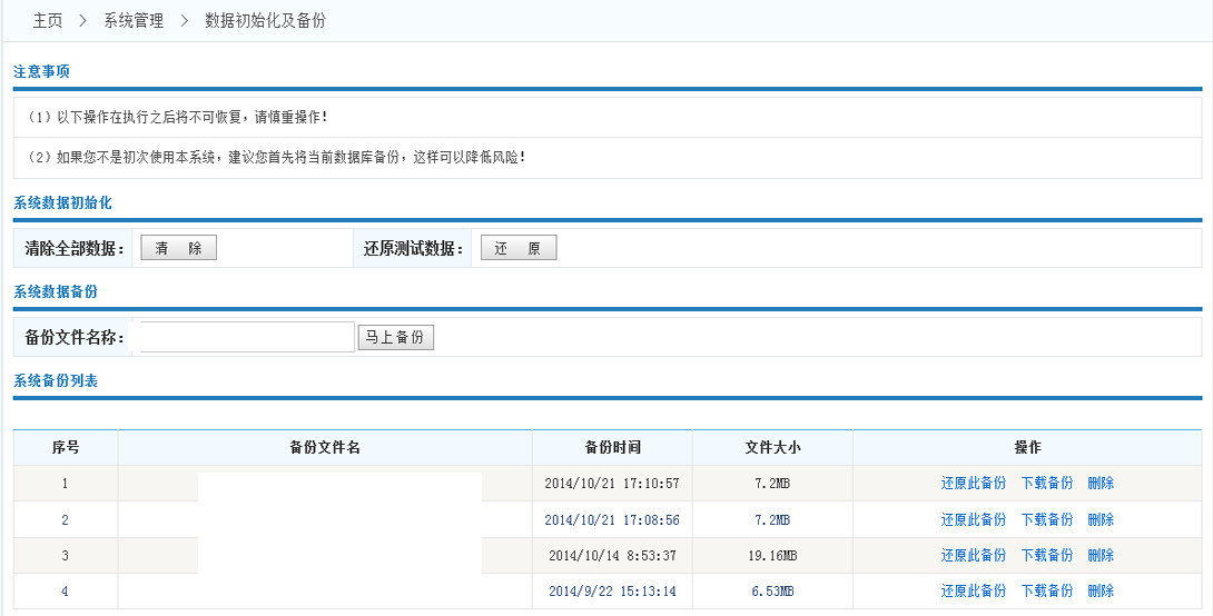 還原:還原測(cè)試數(shù)據(jù) 還原后將覆蓋系統(tǒng)原有的數(shù)據(jù) 此操作不可恢復(fù) 慎重操作!