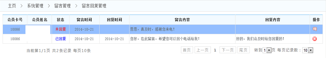 留言列表:在留言列表的狀態(tài)的一欄會標(biāo)注未回復(fù)或已回復(fù);在留言列表的操作一欄