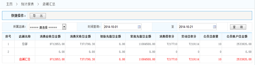 會(huì)員積分排行: 1.導(dǎo)出:將按條件查詢到的數(shù)據(jù) 導(dǎo)出成Excel表格 2.查詢:按照條件查詢出數(shù)據(jù)(例如 根據(jù)會(huì)員的店鋪 時(shí)間段 等)