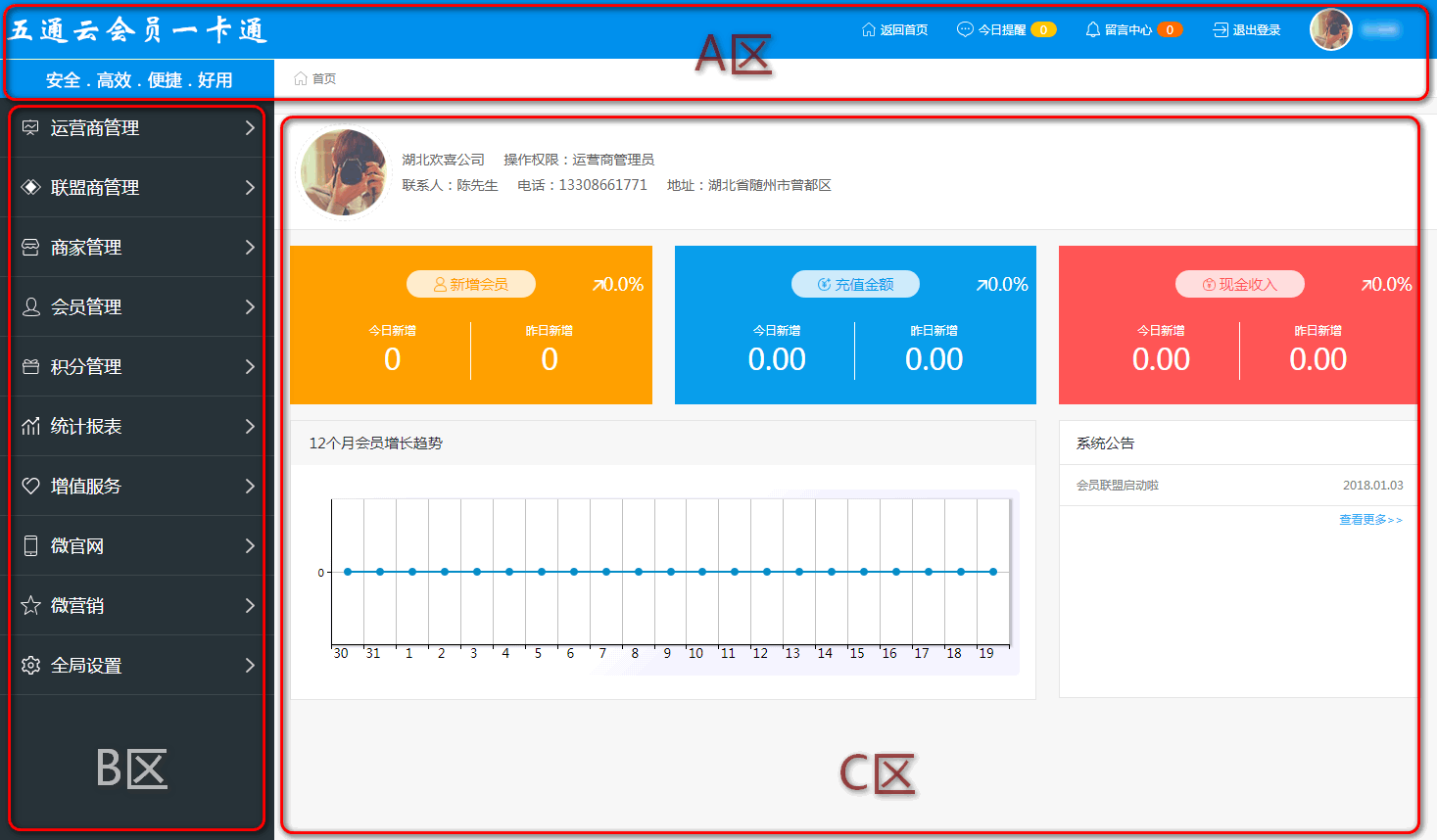 此區(qū)左則顯示系統(tǒng)信息,右側(cè)顯示系統(tǒng)公告。下側(cè)顯示系統(tǒng)提醒列表(會(huì)員生日提醒、積分清零提醒、自定義提醒);